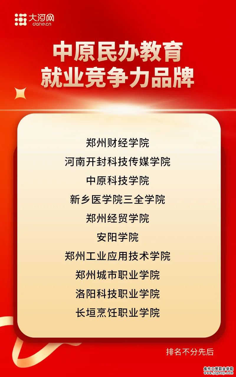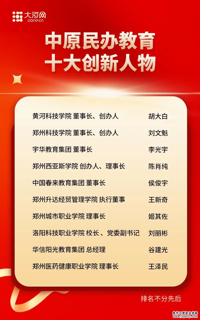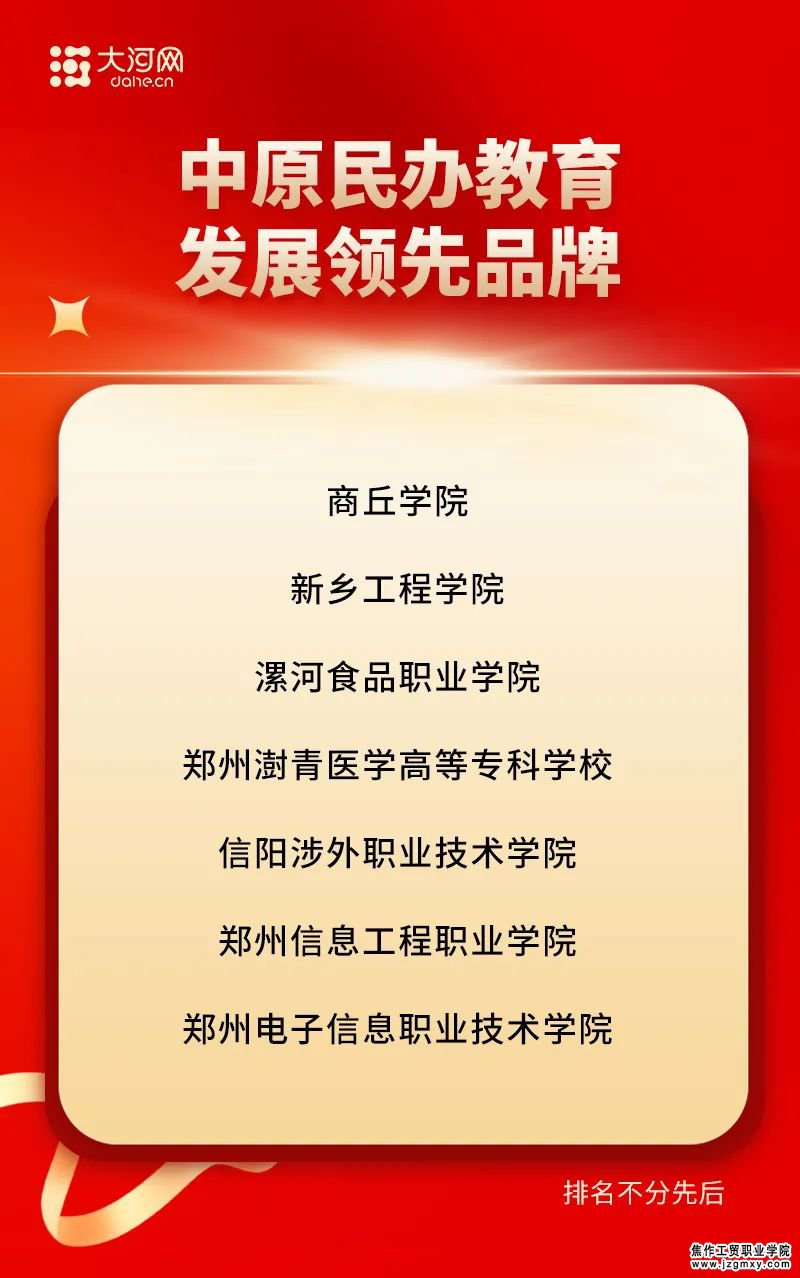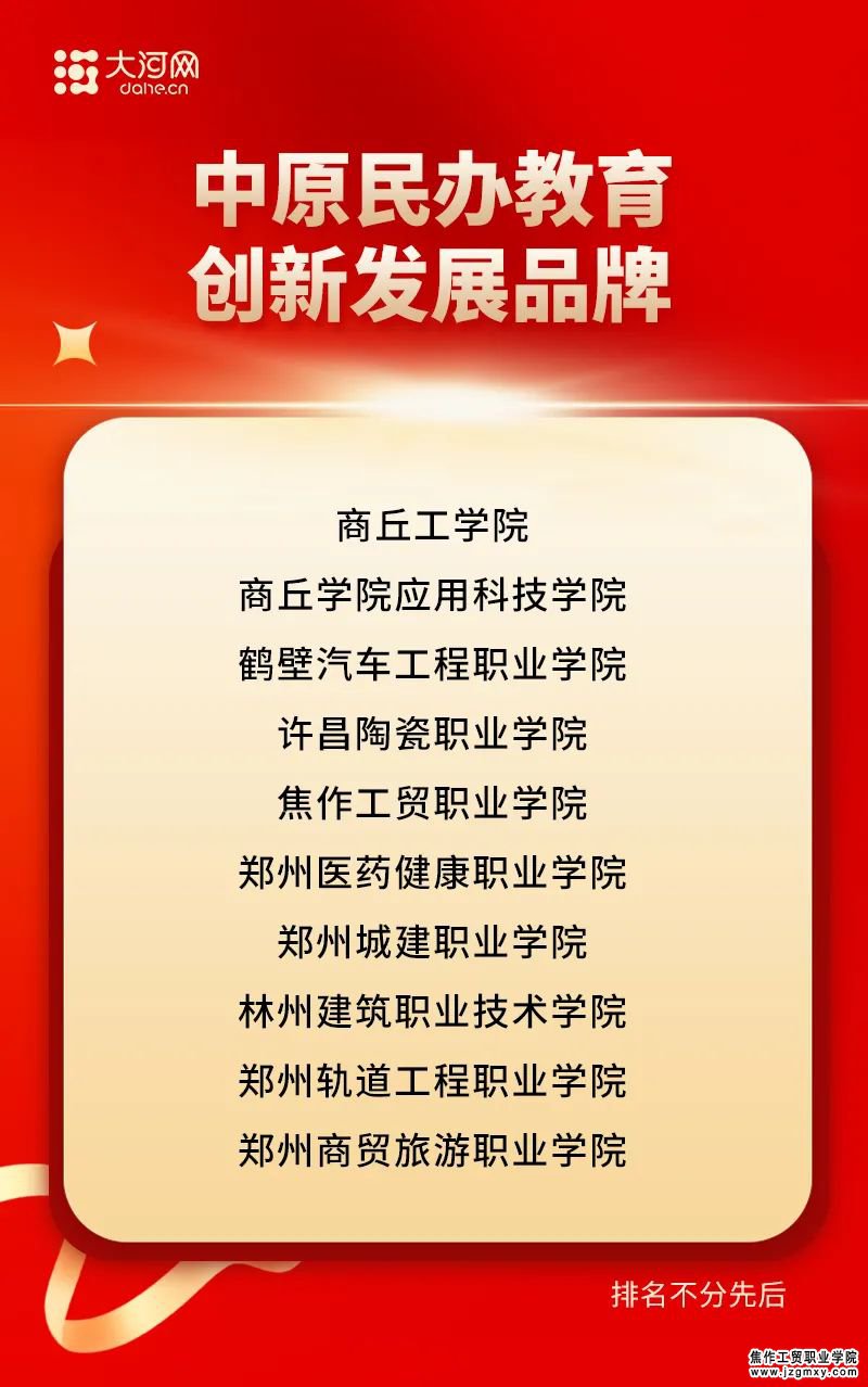 为了全方位展示“十三五”期间及过去一年河南省民办高校发展取得的成绩,对立足教育本质、不断创新突破、为实现河南民办教育跨越式发展积聚创新力量的高校品牌进行表彰和推广,大河网从2021年12月份开始,经过网络征集、综合材料申报、实地探访及舆情大数据分析等方式,历时两个多月,最终评选出“中原民办教育十大创新人物”等五大类奖项,焦作工贸职业学院获“中原民办教育创新发展品牌”荣誉称号。