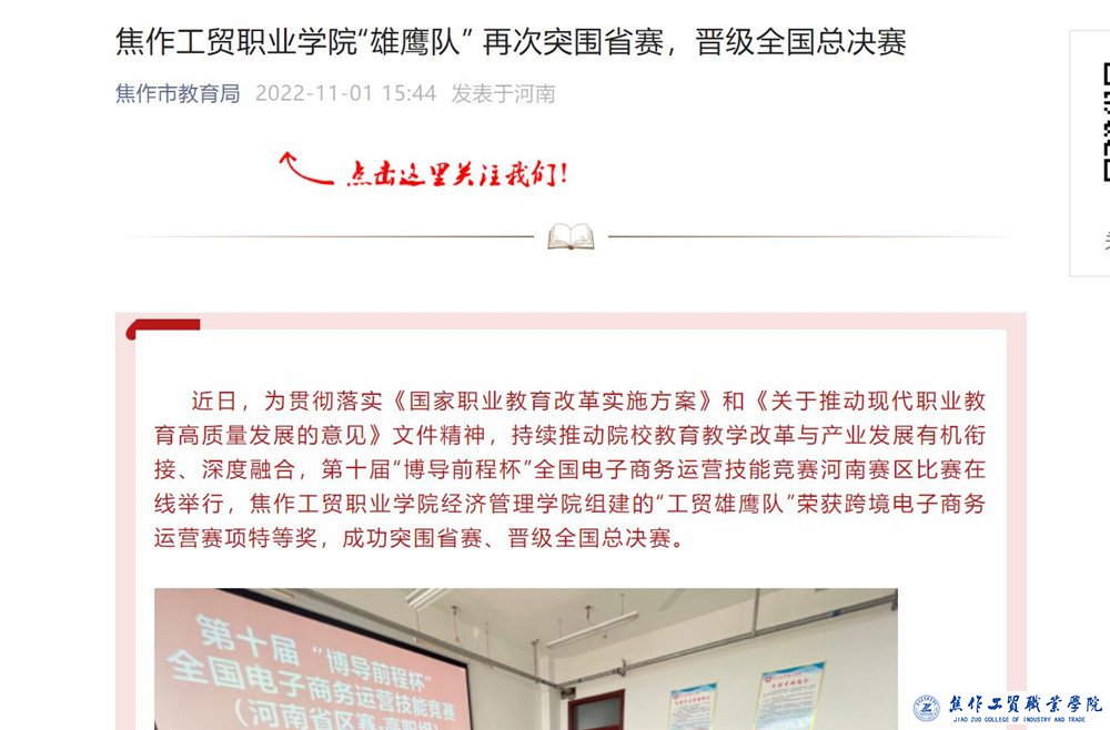 11月1日,焦作市教育局微信公众号以“焦作工贸职业学院‘雄鹰队’再次突围省赛,晋级全国总决赛”为题报道我校学生参赛再次荣获佳绩。内容如下: