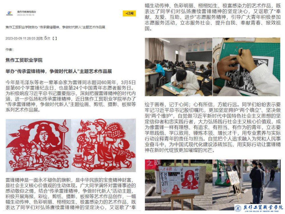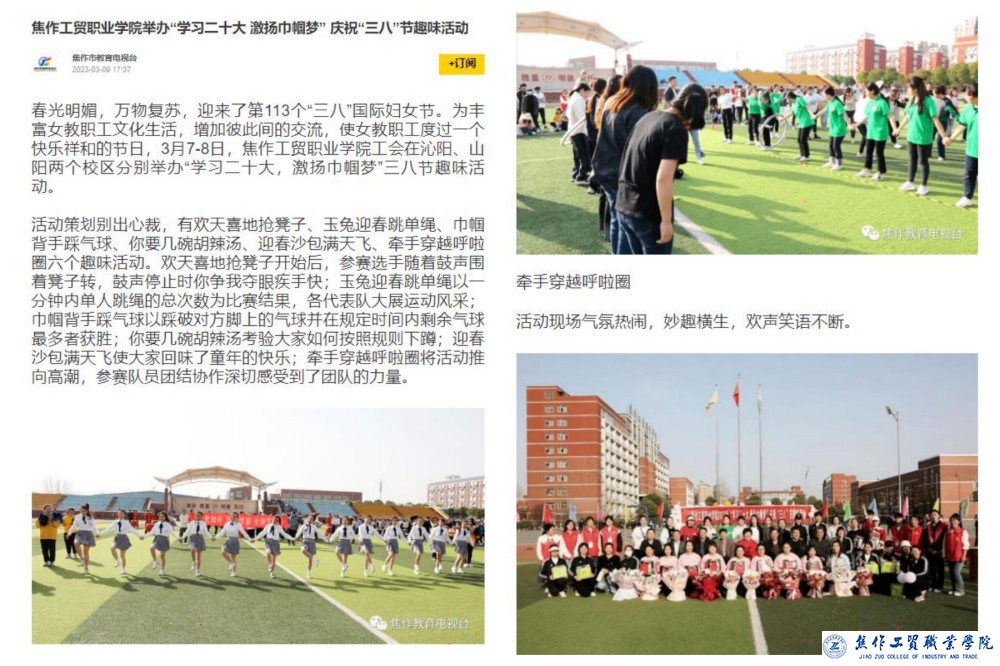 3月9日,搜狐网转发焦作教育电视台新闻,报道我校举办女教工趣味活动和学雷锋活动,标题分别为:焦作工贸职业学院举办“学习二十大,激扬巾帼梦”庆祝“三八”节趣味活动,焦作工贸职业学院举办“传承雷锋精神,争做时代新人”主题艺术作品展。