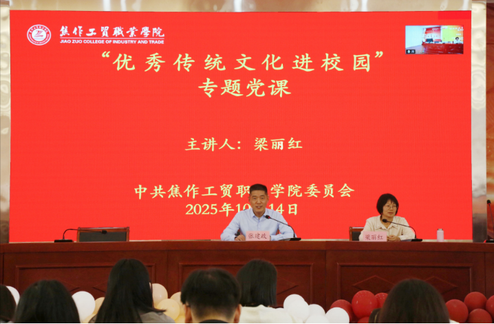 10月14日下午,焦作工贸职业学院报告厅内座无虚席,“优秀传统文化进校园”专题党课——《礼乐朱载堉》在此成功举办。本次活动由党委办公室组织,沁阳校区主会场与山阳校区分会场通过视频连线同步进行,特邀朱载堉纪念馆负责人、市文旅融合发展中心副主任梁丽红担任主讲,带领入党积极分子、发展对象、思政课教师及优秀传统文化爱好者近千人共同走进明代科学艺术巨匠朱载堉的礼乐世界。讲座由党委办主任张建政主持。