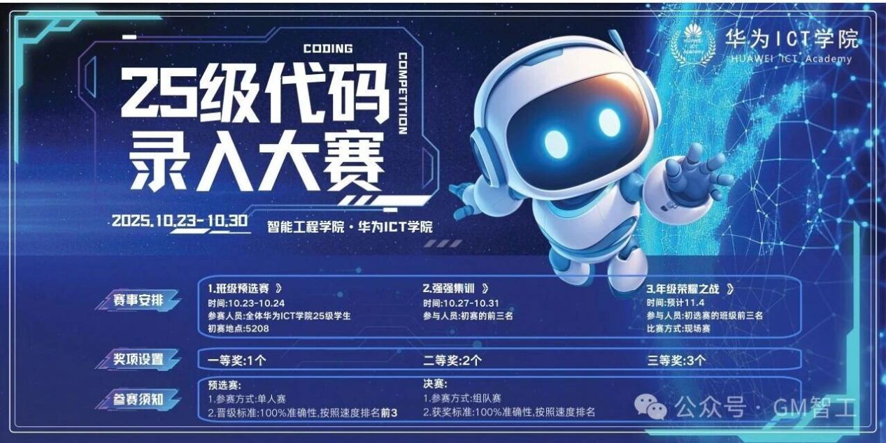 为点燃25级大一新生对编程世界的探索热情,全方位提升专业核心素养,10月23日至24日,智能工程学院华为ICT学院匠心打造的代码录入大赛班级预选赛精彩启幕。这场赛事不仅是新生入学以来编程学习成果的阶段性检验,更成为同学们交流互鉴、绽放自我的璀璨舞台。