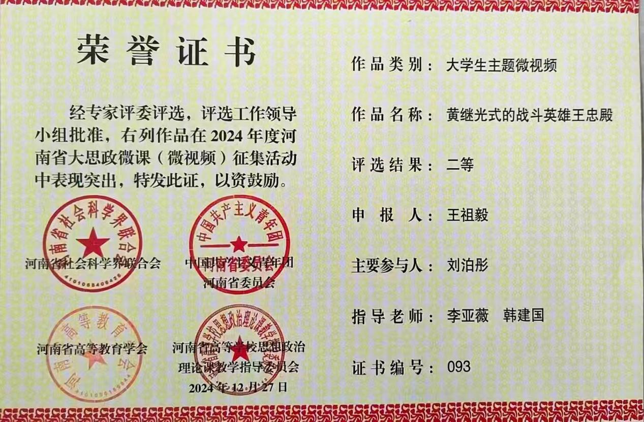 大学生融媒体中心凭借着卓越的实力和不懈的努力,取得了令人瞩目的成绩。中心主任刘泊彤参与制作的《黄继光式的战斗英雄王忠殿》,在2024年度河南省大思政微课(微视频)征集活动中表现突出,荣获二等奖。