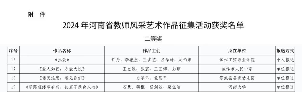参与制作的《热爱》荣获2024 年河南省教师风采艺术作品征集活动二等奖。