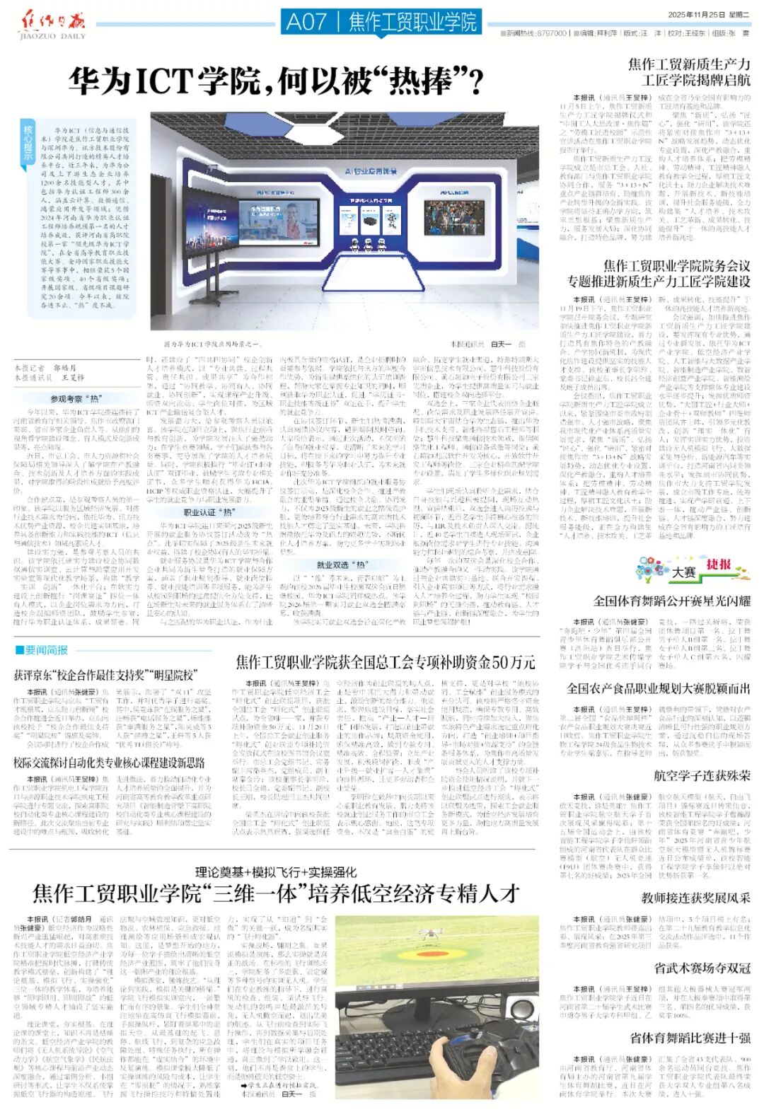华为ICT(信息与通信技术)学院是焦作工贸职业学院与深圳华为、讯方技术股份有限公司共同打造的精英人才培养平台,近三年来,为华为公司及上下游生态企业培养1200余名技能型人才,其中包括华为认证工程师300余人,涵盖云计算、数据通信、鸿蒙应用开发等领域;凭借2024年河南省华为职业认证工程师培养规模第一名的人才培养成效,获评河南省高职院校第一家“领先级华为ICT学院”,在全省高等教育职业技能大赛、金砖国家职业技能大赛等赛事中,相继荣获5个国家级奖项、40个省级奖项;开展国家级、省级项目课题研究20余项。今年以来,该院奋进不止、“热”度不减。
