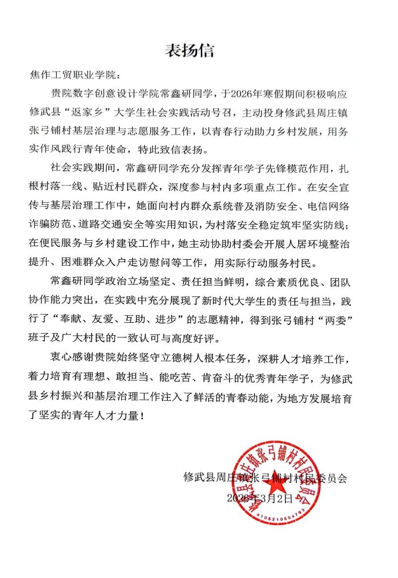 24(五)数字媒体技术应用7班常鑫研,于修武县周庄镇张弓铺村参与志愿活动,扎根乡村基层,积极投身村内各类志愿服务,以认真的态度和扎实的行动完成各项实践任务,凭借优异的表现收获张弓铺村的表扬信,充分展现了学院学子的良好风貌。