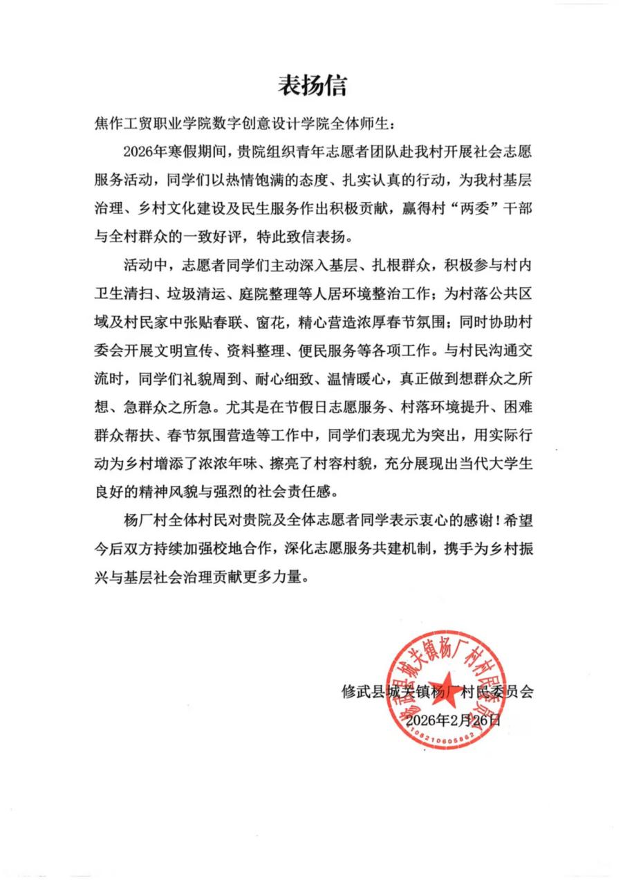 数字创意设计学院青年志愿者团队,于修武县城关镇杨厂村开展志愿服务,参与人居环境整治、营造春节氛围、协助村委开展文明宣传与便民服务等工作,重点做好节假日服务、困难群众帮扶等事宜,用行动擦亮村容村貌、增添乡村年味,赢得杨厂村村“两委”与全村群众的一致好评,该村村民委员会特发来表扬信,对团队的突出表现予以高度肯定与感谢。