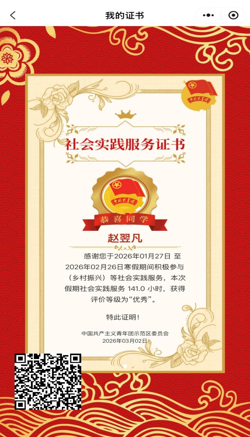 25级影视多媒体技术专业4班赵翌凡,在商丘市城乡一体化示范区农业农村局开展基层实践,化身政策宣传员、数据核查员、为农服务者,制作农业政策宣传材料、复核民生关键数据、走村入户答疑解惑,还参与扫雪除冰志愿工作,累计服务141小时,获共青团示范区委员会颁发的社会实践服务证书,评价等级为“优秀”。