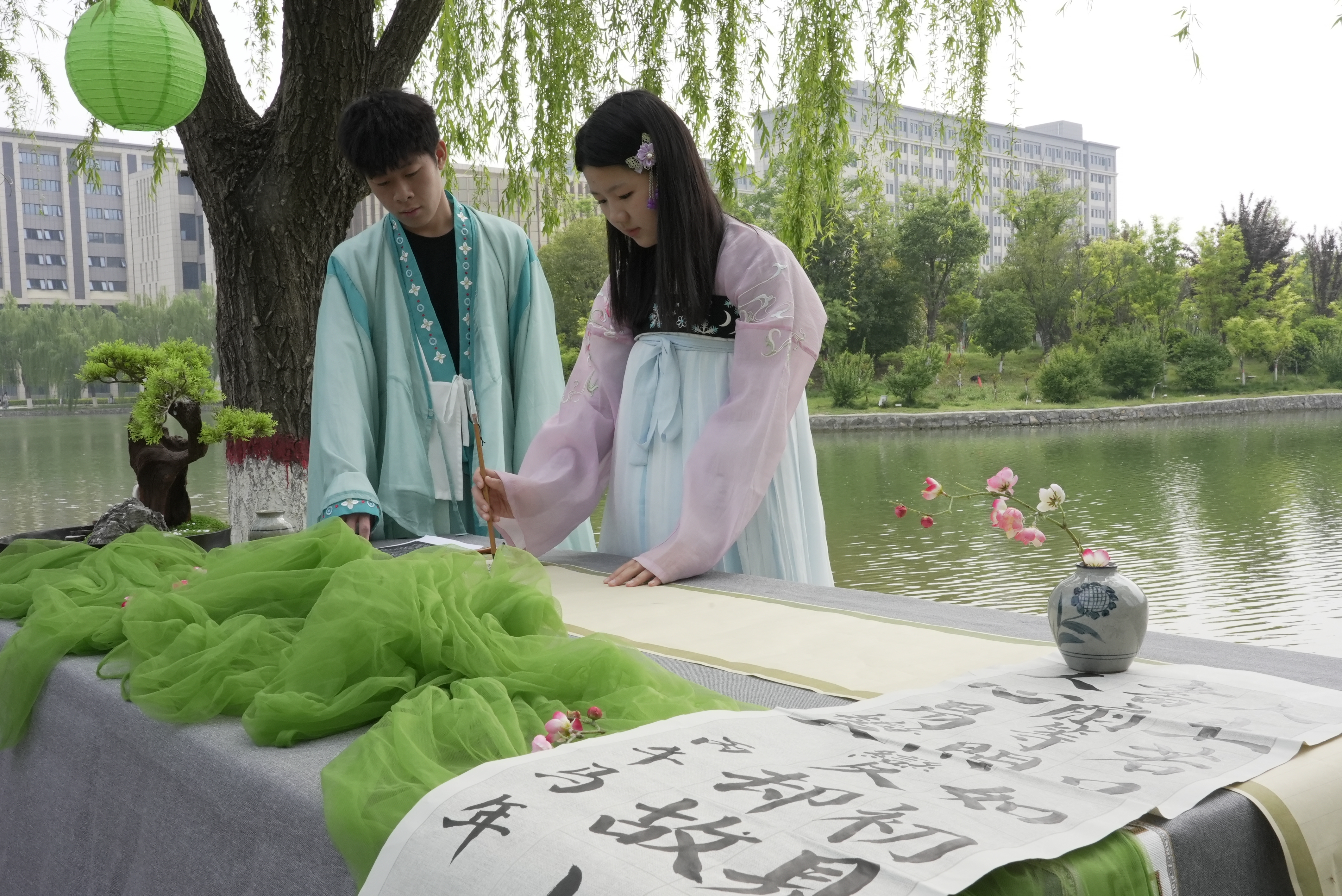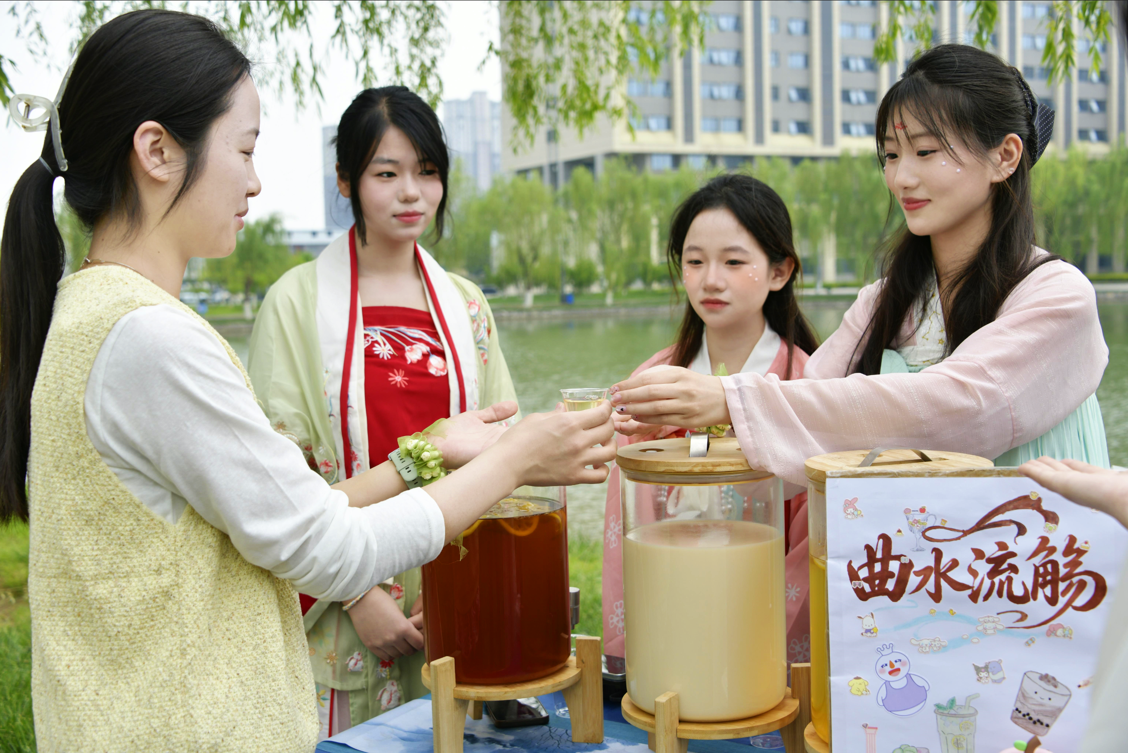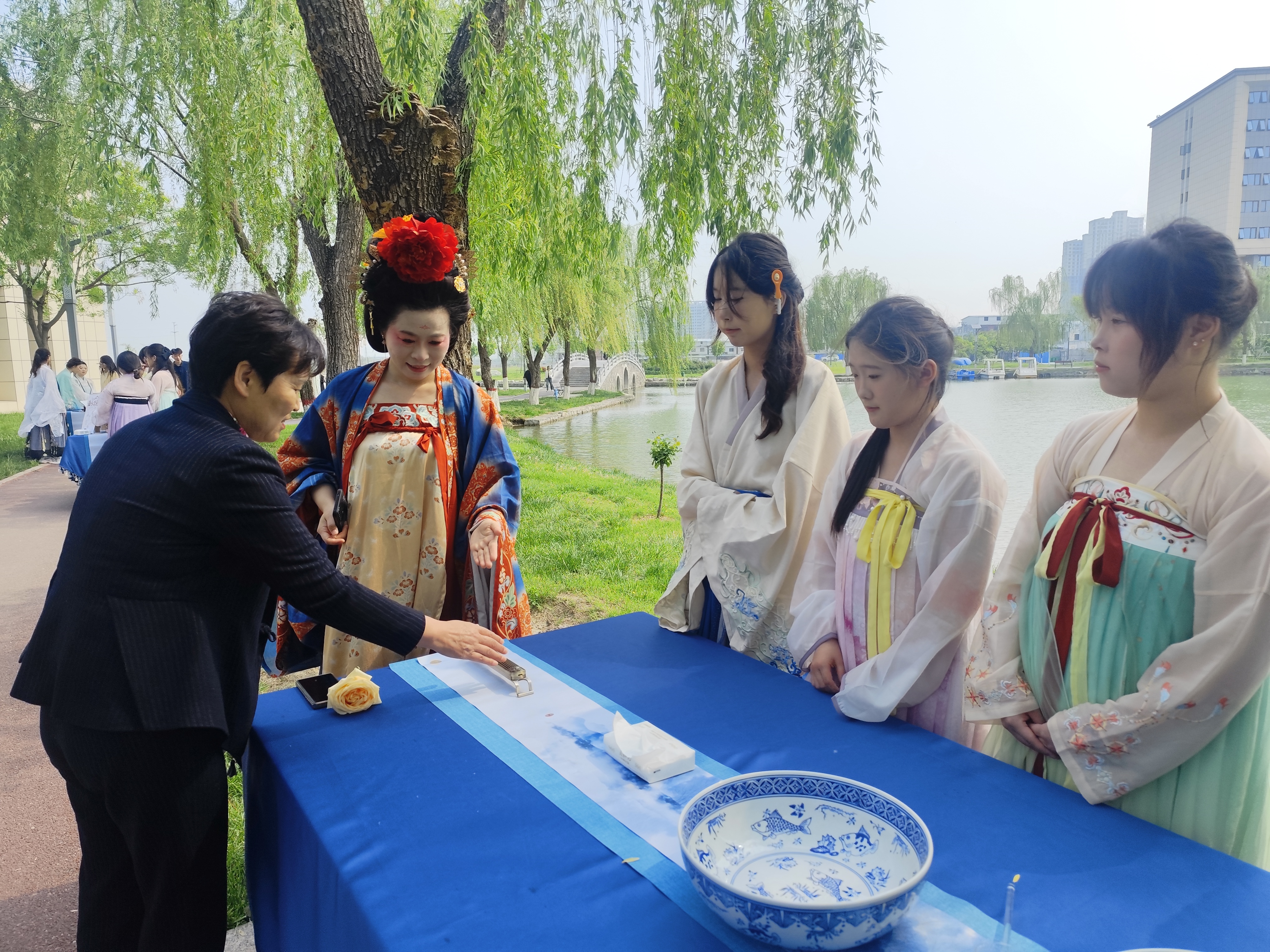 活动采取“户外民俗体验+室内文化盛宴”的双场模式。在户外分会场,一场富有仪式感的“春日修禊”拉开序幕。嘉宾与师生在沐春净手、曲水流觞、香草手作中切身感受传统民俗的独特魅力。汉服志愿者以标准的拱手礼迎宾,现场开展的礼仪教学让师生在雅致互动中领略华夏礼仪之邦的气蕴。