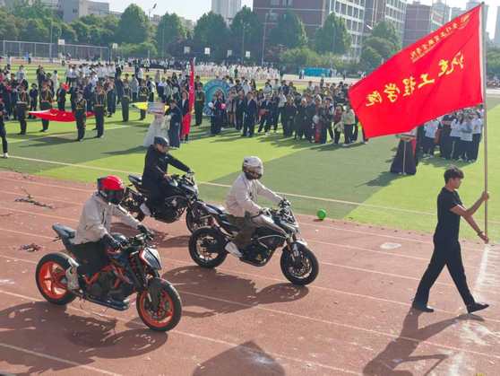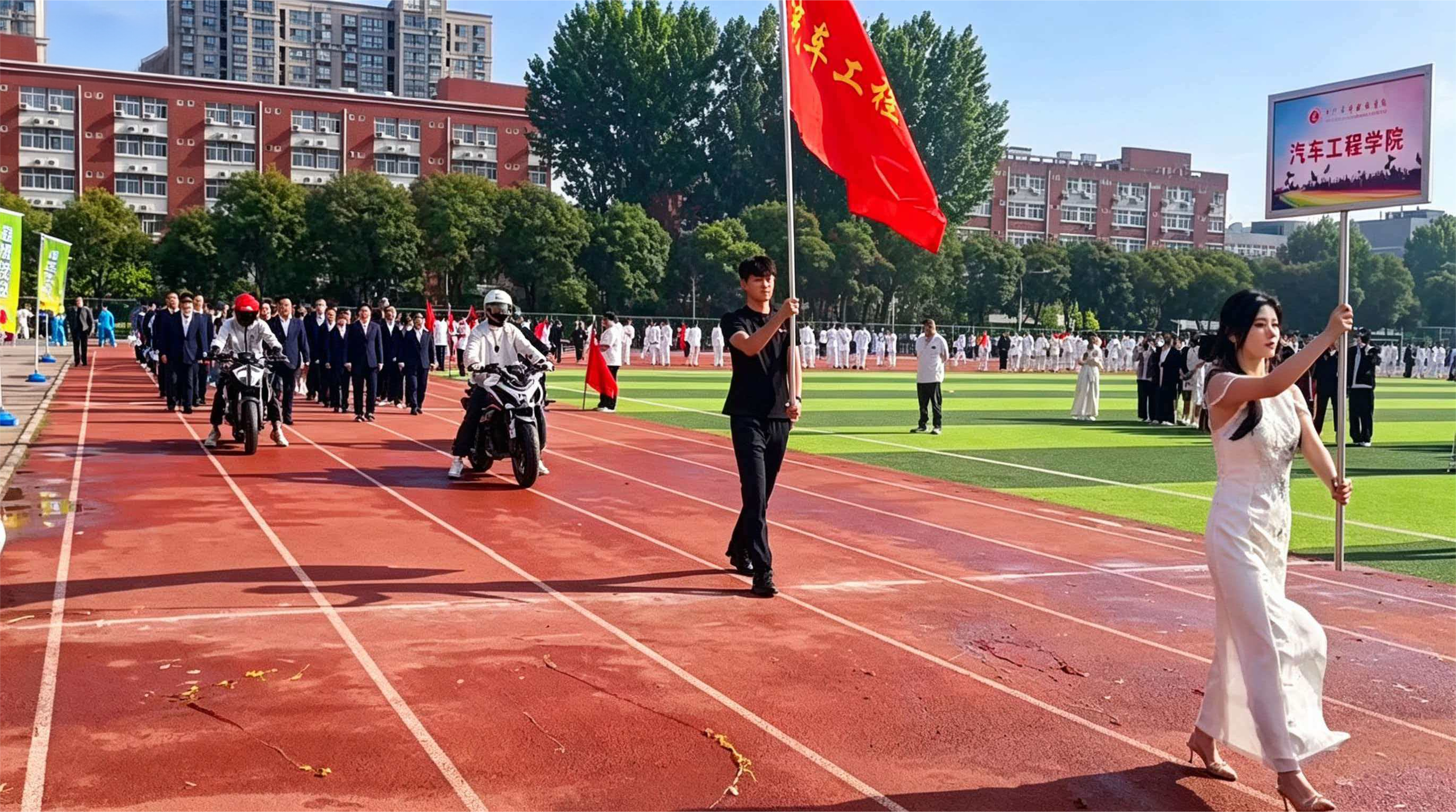 开幕式入场环节,汽车工程学院方阵一登场便吸引了全场目光。由举牌手引领、擎旗手护旗的先导队伍步伐铿锵,随后三辆机车引擎轰鸣,在跑道上划出一道充满速度与激情的轨迹,将汽车专业的硬核魅力展现得淋漓尽致。紧随其后的教师方队,身着笔挺西装,精神抖擞、步履整齐,展现了汽车工程学院教师队伍严谨务实、昂扬向上的精神风貌;女生方队活力四射的表演洋溢着青春的朝气,将赛场氛围瞬间点燃;男生表演方队则以整齐划一的舞蹈动作,展现了团结协作、充满朝气的少年风采;身着工装、手持工具的特色方阵更是亮眼,同学们身着专业工装,以汽车维修工具为元素,生动诠释了汽车工程学院学子“知行合一、精益求精”的专业素养,也将汽车专业“严谨、专注、创新”的工匠精神融入其中。