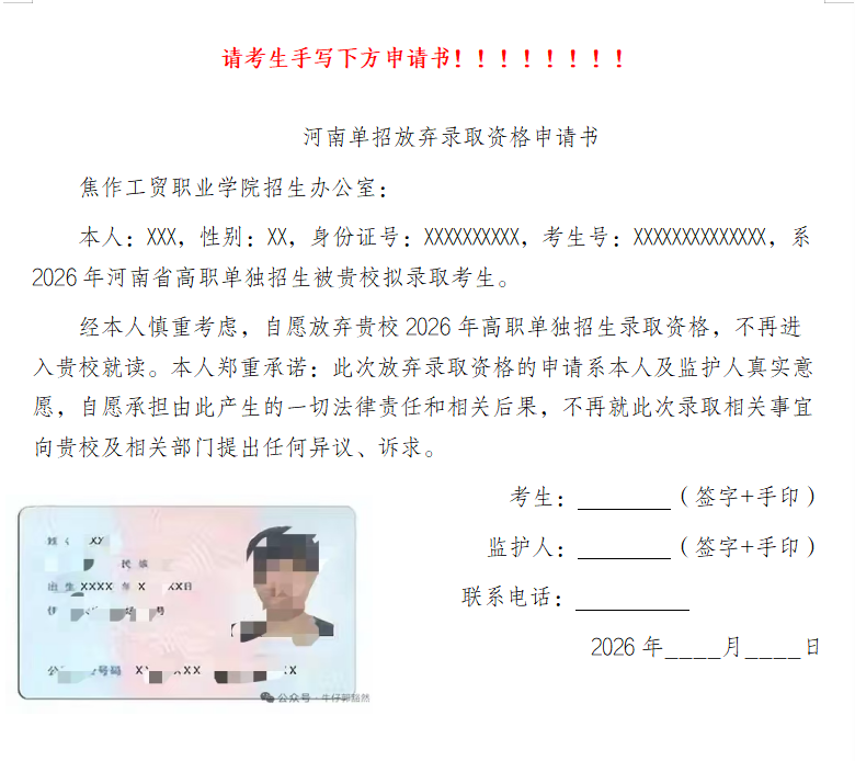1.办理方法:自愿放弃拟录取资格的考生,请务必于5月9日前(超出规定时间不予受理)向学校招生办公室提交(手写)自愿放弃声明。联系招办0391-5282031提交放弃资料。