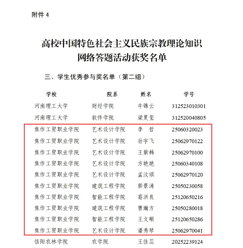 在高校中国特色社会主义民族宗教理论知识网络答题活动中,我校大一新生取得了参赛率、及格率、优秀率100%,满分率99.8%的优异成绩,尤其是艺术设计学院、建筑工程学院以及智能工程学院的李哲、孙宇飞等10位同学荣获省级学生优秀参与奖。这一成绩体现了学校在民族宗教理论教育方面的扎实成效,以及学生对国家民族政策的深刻理解和高度认同。