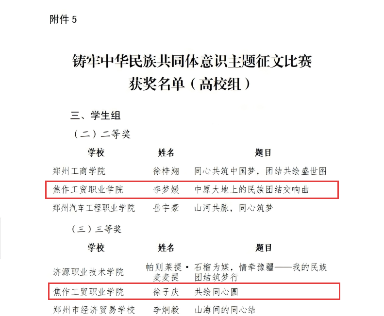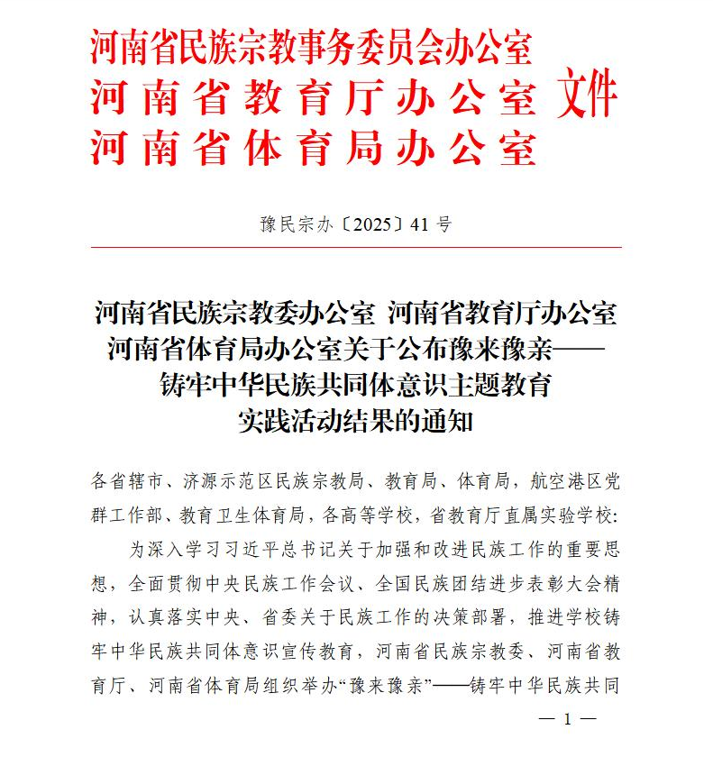 近日,河南省民族宗教事务委员会、河南省教育厅、河南省体育局联合公布了“豫来豫亲”铸牢中华民族共同体意识主题教育实践活动评选结果。焦作工贸职业学院在本次活动中表现优异,师生团队在多个项目中脱颖而出,充分展现了学校在民族团结进步教育方面的扎实成效和师生良好的精神风貌。