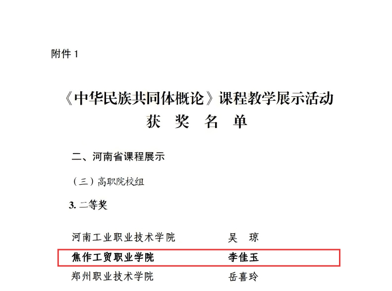 在《中华民族共同体概论》课程教学展示活动中,我校马克思主义学院教师李佳玉凭借扎实的教学功底和深入浅出的授课方式,荣获高职院校组二等奖。