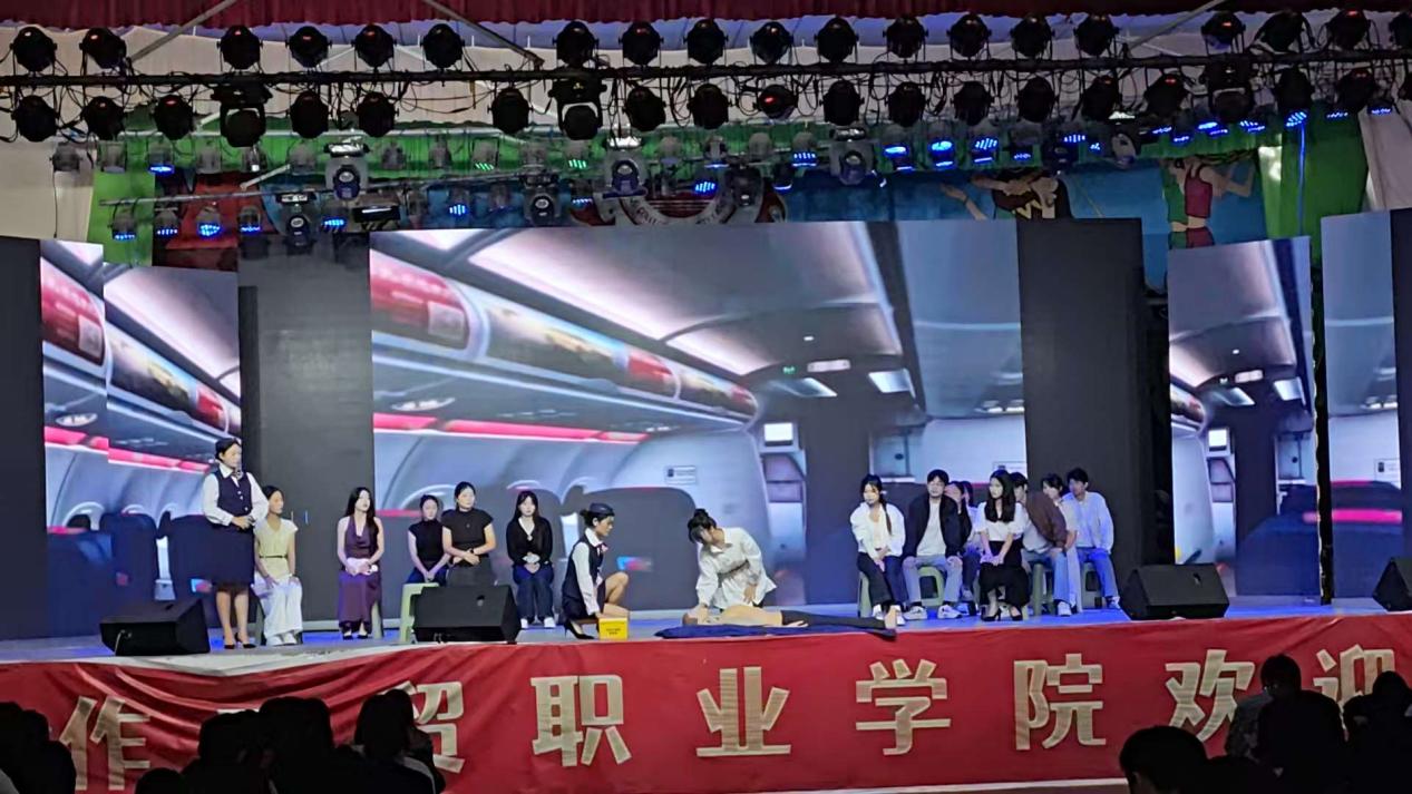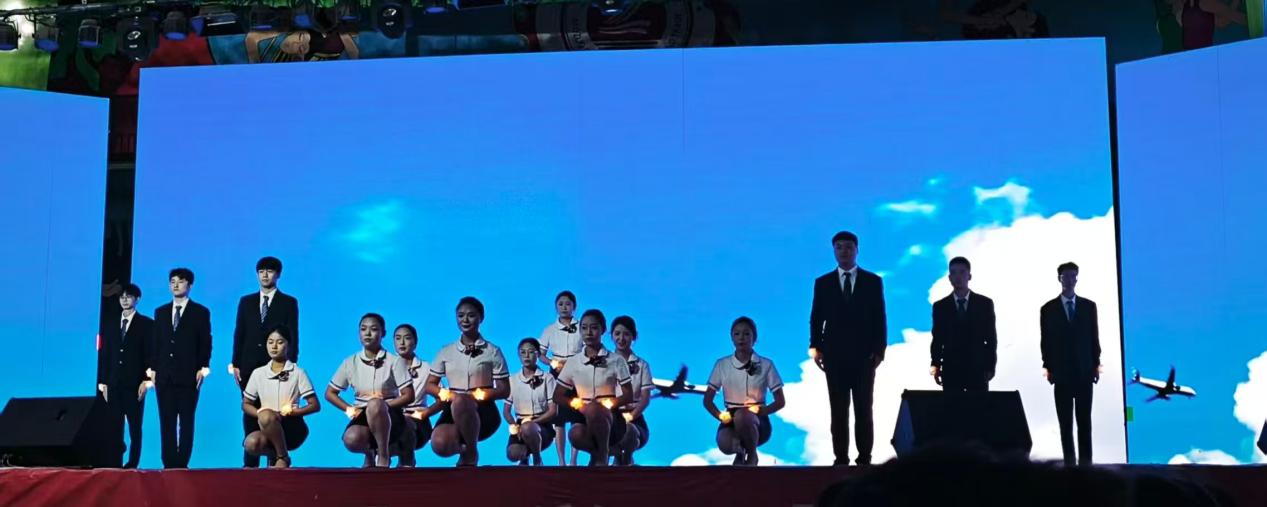 演员们用细腻的表现诠释了空乘礼仪的温度,递物时掌心向上的礼貌、与旅客交流时温和的眼神、指引向时标准的手势。细节里满是对旅客的尊重与关怀,将“以客为尊”的服务理念展现得淋漓尽致让现场观众直观感受到航空服务专业的职业温度与行业标准。