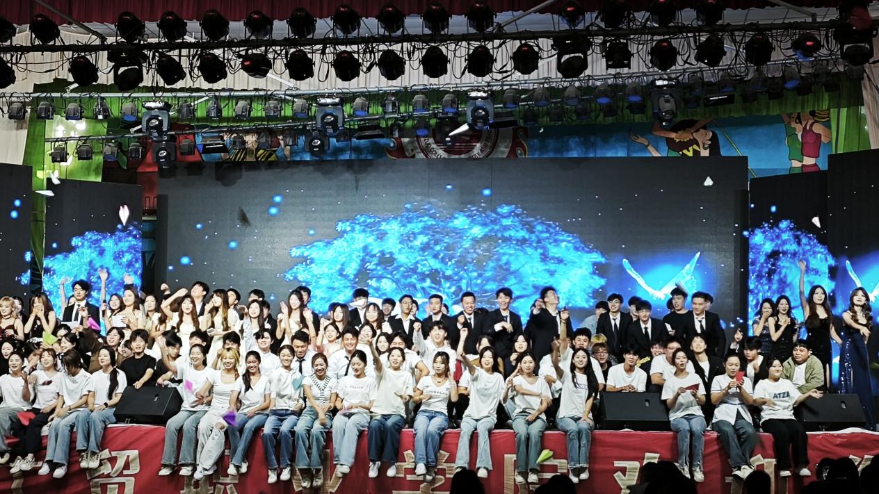 在谢幕环节,师生同台合影留念,依依不舍;最后,全场共同放飞纸飞机,五彩的纸飞机承载着祝福与梦想,在体育馆上空盘旋,为汇演画上圆满句号。