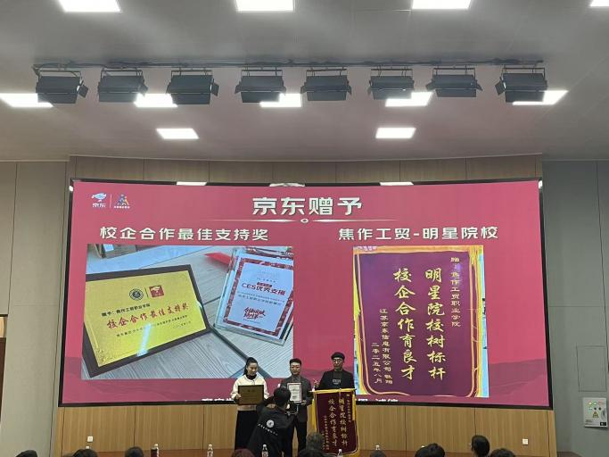 京东校内项目主管杜宇凡致辞时,对学院的人才培养质量给予高度认可。“焦作工贸学子的专业素养和敬业精神令人印象深刻,不少毕业生已成为团队核心力量,这正是我们授予学院两项荣誉的根本原因。”杜宇凡展示了刻有“校企合作育良才,明星院校树标杆”的牌匾,强调双方从定向培养到实训共建的深度融合,已实现“人才共育、资源共享”的良性循环。他表示,京东将以双十一为契机,为学子提供实战岗位与技能培训,助力优秀人才成长。