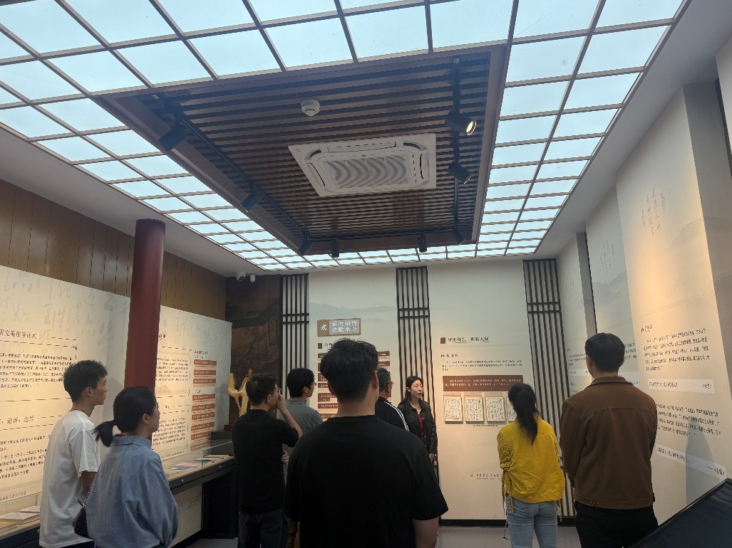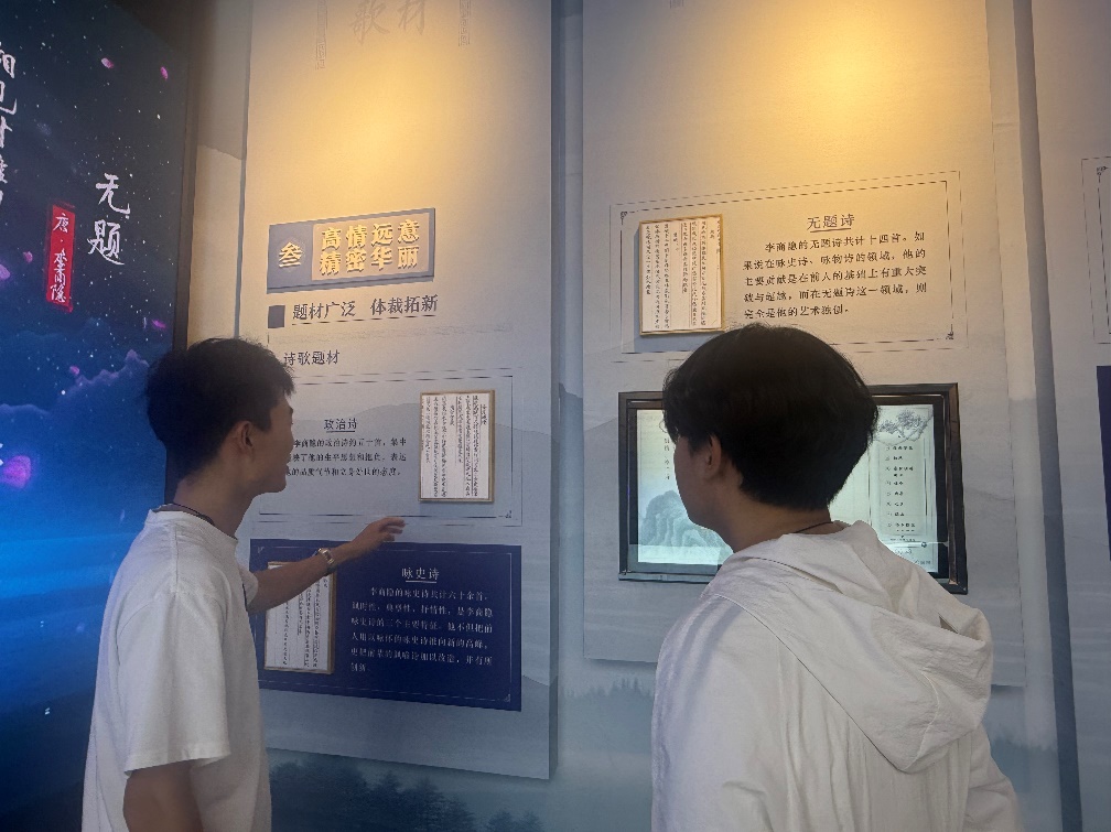 李商隐纪念馆坐落于焦作市怀川文化核心区域,馆内通过全息投影、文物陈列、诗文拓印等多种形式,立体化呈现了“诗客”李商隐的生平轨迹与文学成就。机电工程学院学生在展品前驻足凝思,或轻声诵读碑刻诗句,或用手机记录文物细节。在“高情远,意精密华丽”展区前,同学们展开讨论,李商隐的诗风细腻而多情,《银河吹笙》中“怅望银河吹玉笙”,不禁人联想到焦作云台山的飞瀑,同学们纷纷感慨,艺术源于生活,诗人的灵感也藏在家乡的一草一木中。