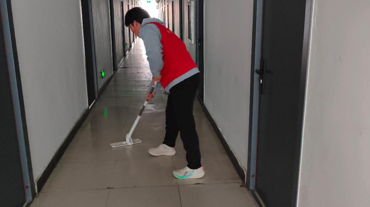 同学们深入宿舍楼道、教学楼前广场等校园区域,分工协作、默契配合,细致清扫地面垃圾、认真擦拭公共设施,对卫生死角进行彻底清理。志愿者们手持拖把,反复擦拭宿舍楼道的地面污渍,为同学们营造干净舒适的居住环境;弯腰俯身捡拾广场及周边的纸屑、杂物,用点滴行动守护校园公共环境的整洁美观,在躬身劳动中真切体会奉献的价值与意义。