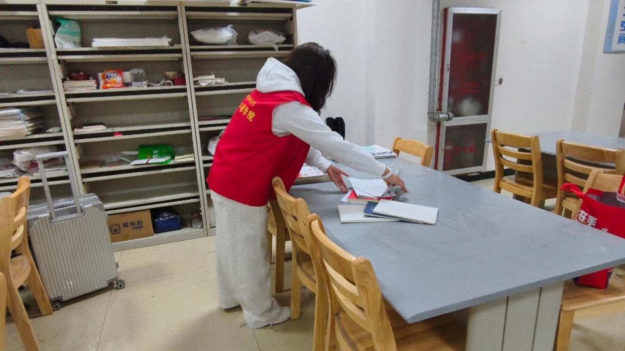 在教室、自习室与食堂等师生高频活动场所,志愿者们各尽其责、细致服务:将自习室桌面的书籍、资料归置整齐,清理桌面杂物,为同学们打造有序的学习空间;认真擦拭教室黑板,清除粉笔字迹与灰尘,为课堂教学做好充分准备;仔细擦拭食堂餐桌、清理残留杂物,同时主动提醒师生文明就餐、按需取餐,助力校园营造节约用餐、文明有序的良好氛围。