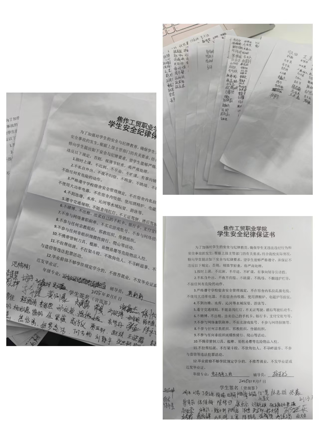 班主任通过播放宿舍违规用电起火、校外溺水等警示短视频,结合“事故为何可避免”的提问,迅速引发学生对安全纪律的重视,自然切入主题。随后,班主任依托PPT,围绕《焦作工贸职业学院规章制度汇编》及《学生安全纪律保证书》核心内容,重点讲解宿舍“四严禁”、校园活动安全禁忌、纪律规范要求,以及学分与毕业的关联,期间穿插学生违规受处分、网络刷单被骗等真实案例,让学生直观知晓违规后果。班会尾声,班主任分发保证书,带领学生逐条款研读,学生签署姓名后由班主任统一保管。最后,班主任总结强调安全纪律对生命财产的保障作用,号召学生将规则意识融入日常。