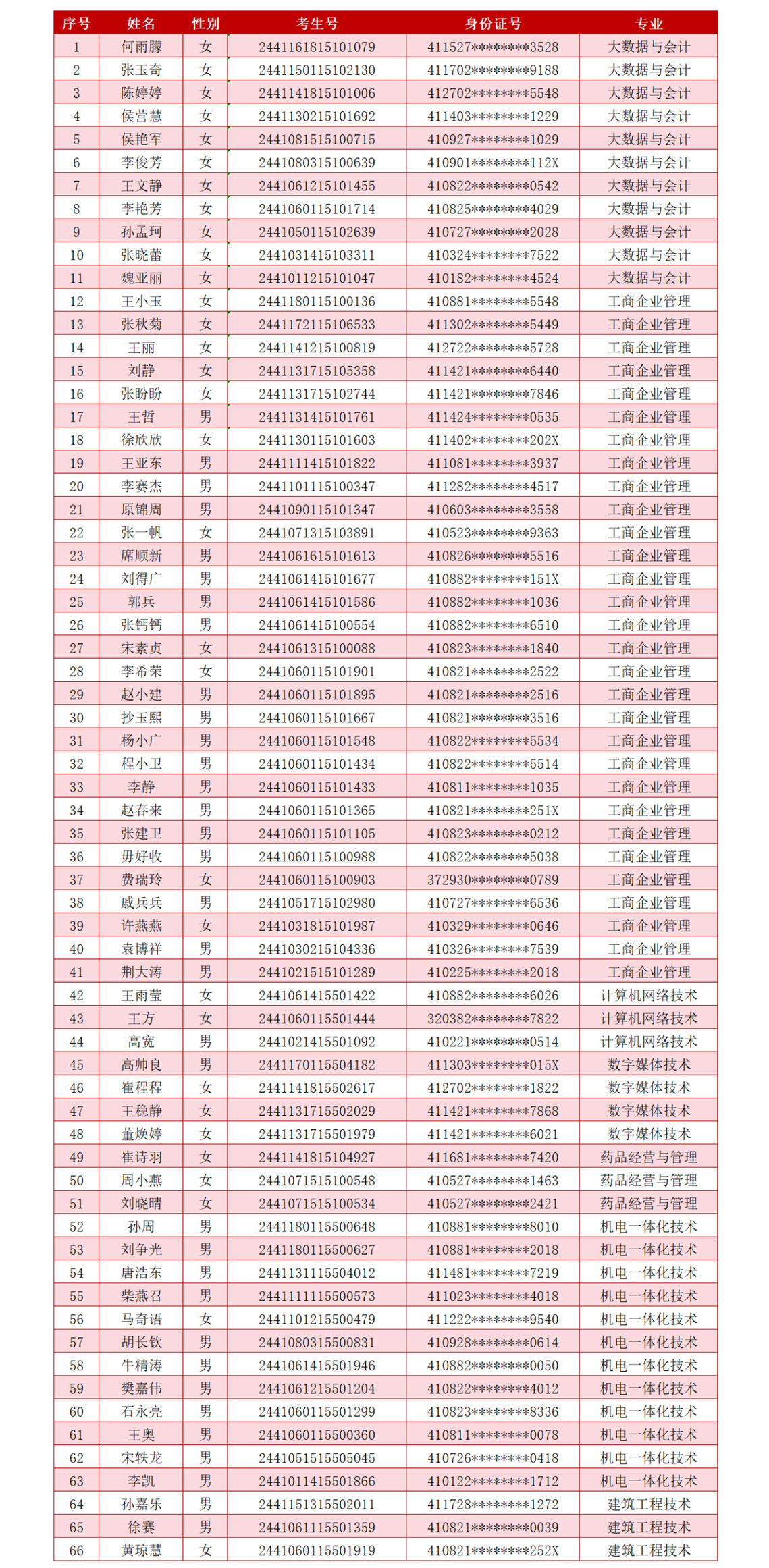 根据中华人民共和国教育部第41号令《普通高等学校学生管理规定》、《高等学校学生学籍学历电子注册办法》和院政文【2023】65号《焦作工贸职业学院高等学历继续教育学生学籍学历管理规定》等文件要求,经我校继续教育学院反复联系确认,共有66名新生未在规定时间内按要求办理入学报到手续,拟将其视为自动放弃入学资格人员,不予注册学籍,名单予以公示(详见附件)。公示期自2025年3月11日至2025年3月26日。如有异议,可在公示期内以书面形式向继续教育学院提出申请,书面材料须签署本人真实姓名及联系方式。公示期满结束后仍未办理入学手续的新生,不予注册学籍。