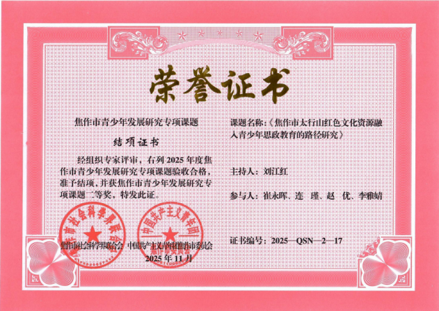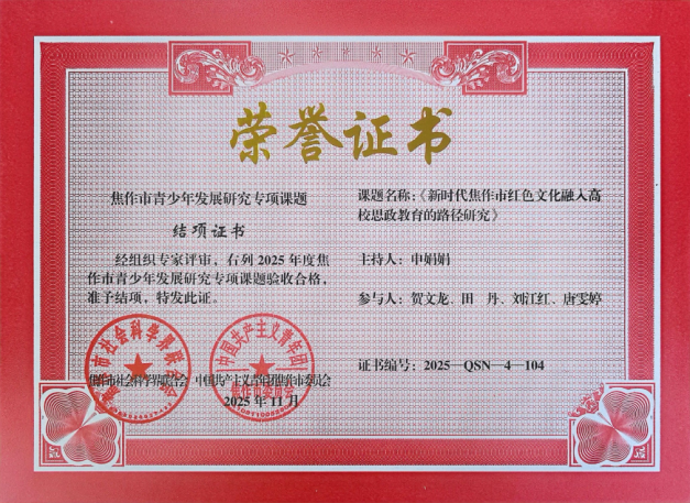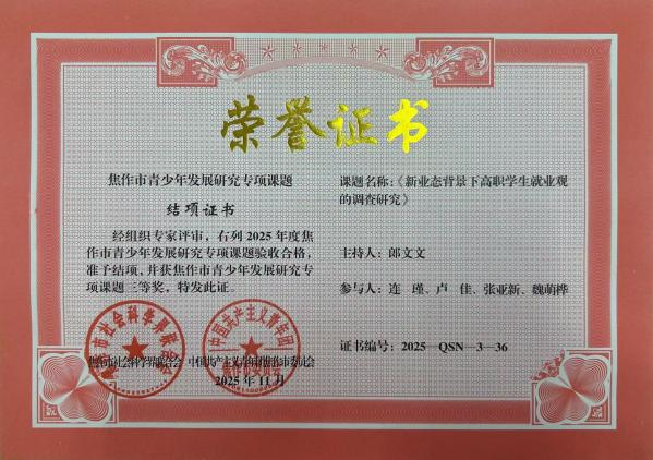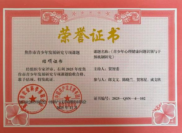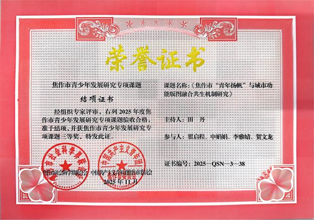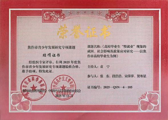 近日,焦作市青少年发展研究专项课题评审结果正式公布。我院教师主持的七项课题全部通过验收,顺利结项。其中,四项课题凭借其研究深度、实践价值与创新性脱颖而出,分获二等奖与三等奖,彰显了我院在青少年发展研究领域的扎实积累与科研实力的持续提升。