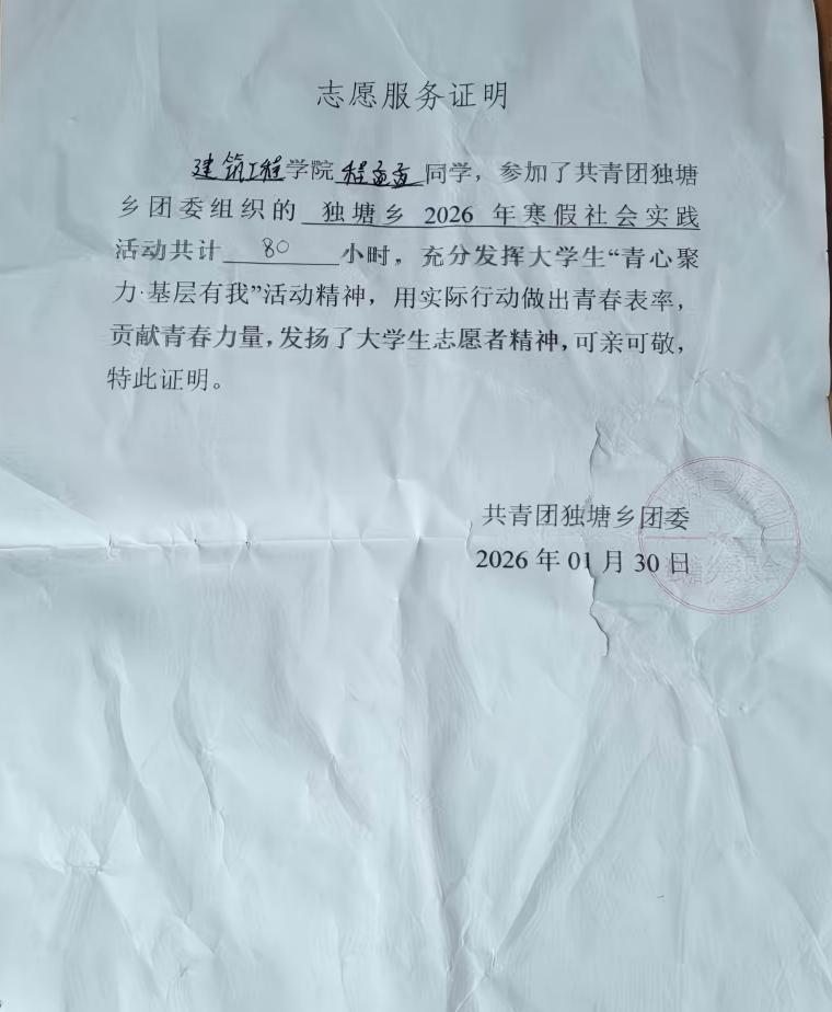 寒冬虽至,青春滚烫。在2026年寒假期间,共青团独塘乡团委组织开展“青心聚力・基层有我”寒假社会实践活动,智慧建造工程学院程苗苗同学主动响应号召,投身基层志愿服务,累计服务时长80小时,以实际行动践行青年担当,为家乡发展注入青春动能。