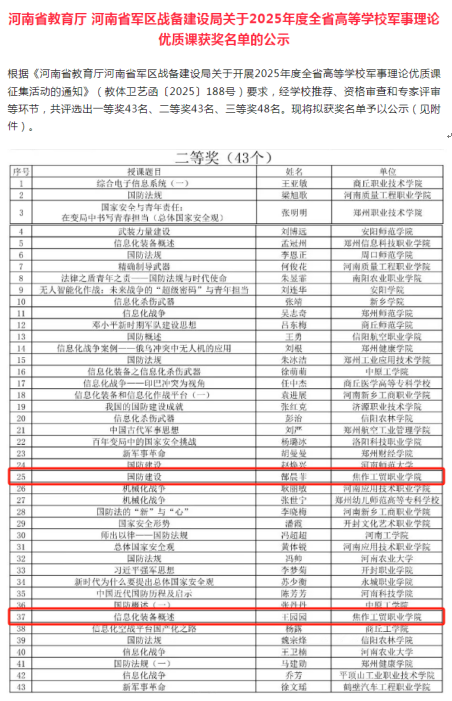 近日,河南省教育厅、河南省军区战备建设局联合公布了2025年度河南省高等学校军事理论优质课评奖结果,我院教师郜晨菲的《国防建设》和王园园的《信息化装备概述》课程均获二等奖。
