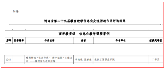 近日,由河南省教育厅办公室举办的河南省第二十九届教育教学信息化交流活动评选结果揭晓。我院副院长李艳艳、思想道德与法治教研室主任王岩佳共同报送的信息化教学课程案例《理想铸魂·信念传承·数字赋能·多维互动——理想信念教学矩阵》凭借其创新的教学理念、前沿的技术应用和显著的教学实效,荣获高等教育组“信息化教学课程案例”二等奖。