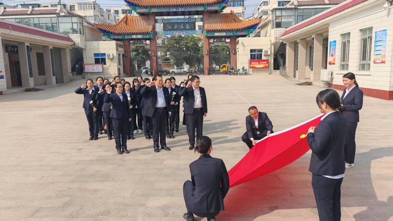 敬献花圈后,全场肃立,向为国家和人民事业牺牲的烈士默哀一分钟。随后,全体党员教师面向鲜红的党旗,高举右拳,重温入党誓词。