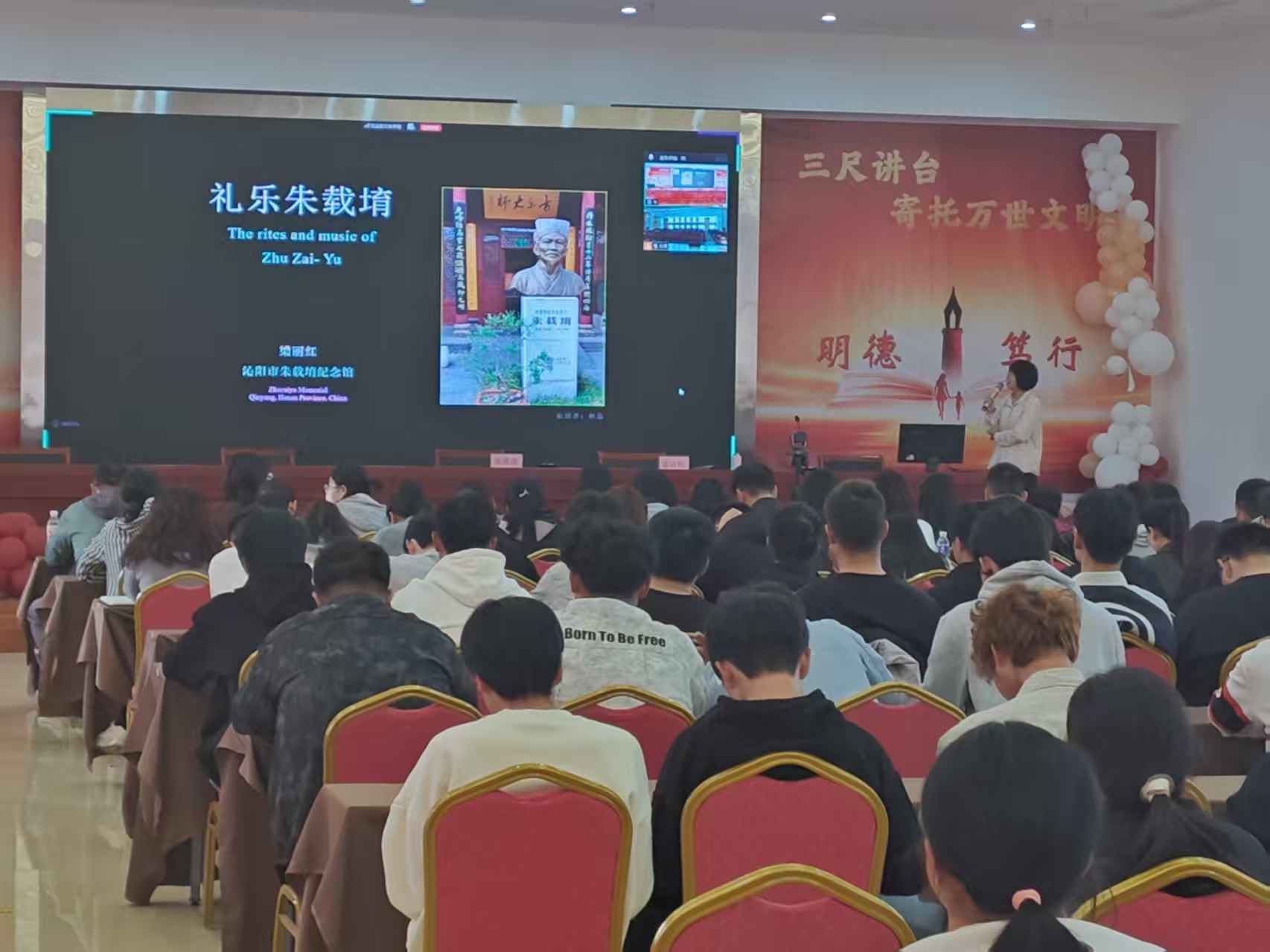 2025年10月14日下午,汽车工程学院支部委员会组织委员谢志强老师带领汽车工程学院教师在学院宾馆楼8楼会议室参加了优秀传统文化进校园专题党课活动。此次党课特邀沁阳市文旅融合发展中心主任梁丽红同志主讲,以“礼乐朱载堉”为核心主题,为我们打开了一扇触摸中华优秀传统文化的大门,是学院深化文化育人、推动教师文化素养提升的重要实践。
