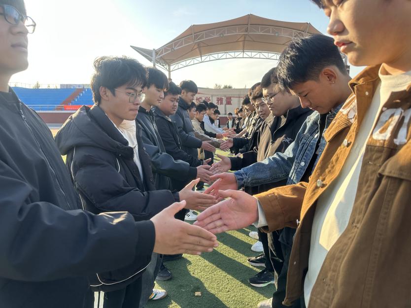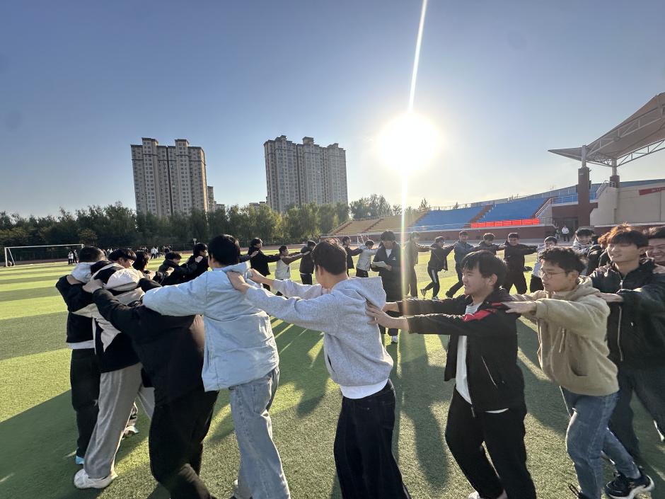 随后的“拍打穴位”环节更让现场暖意融融。新生们起身围成圆圈并向右转,后面的同学为前方同学轻柔捏肩按摩、拍打穴位,伴随着“走起来呀走起来,捏捏肩呀捏捏肩”的欢快口令,大家步伐整齐,动作轻柔。完成一轮后,同学们默契转身,互换角色继续互动。身体的接触拉近了心灵的距离,不少同学表示,这种面对面的温暖互动,让初入校园的自己感受到了别样的亲切与关怀。