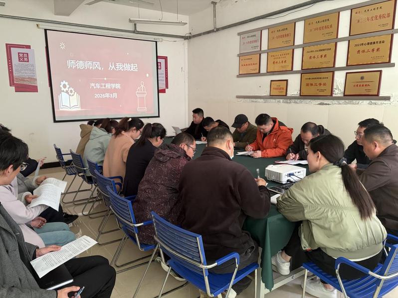 为全面加强教师队伍思想政治建设,严守师德师风底线,践行立德树人根本任务,近日,汽车工程学院组织全体教师开展专题师德师风培训,并举行庄严宣誓仪式,进一步凝聚育人共识,锤炼师者匠心,助力学院工科教育高质量发展。培训环节中,学院领导围绕《新时代高校教师职业行为十项准则》,结合汽车专业育人特点,深入解读师德师风建设核心要求,通过政策文件领学、等形式,引导全体教师深刻认识师德师风是教师立身之本、育人之基。培训重点强调,作为工科专业教师,既要深耕汽车工程专业教学与科研,练就过硬业务本领,更要坚守师德底线,秉持严谨治学、关爱学生、廉洁从教的理念,做到言传身教、以德施教,全力培养兼具专业素养与职业品德的高素质汽车行业人才。培训结束后,全体教师神情肃穆,整齐列队举行师德师风宣誓仪式。在领誓人的带领下,大家右手举拳,面向教育使命庄严宣誓,誓言铿锵有力、掷地有声,饱含着全体教师恪守师德、潜心育人、爱岗敬业、廉洁自律的坚定决心,彰显了汽车工程学院教师队伍坚守教育初心、勇担育人使命的责任担当。此次活动进一步强化了全院教师的师德意识与责任意识,规范了职业行为准则。参与教师纷纷表示,将以此次培训和宣誓为契机,把誓言