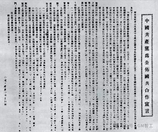 1937年9月22日,国民党中央通讯社发表《中共中央为公布国共合作宣言》。23日,蒋介石发表谈话,实际上承认了中国共产党的合法地位。国共两党实现第二次合作,以国共合作为主体的抗日民族统一战线正式形成。