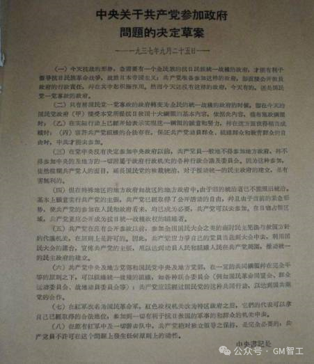 1937年9月25日,中共中央发出《关于共产党参加政府问题的决定草案》,指出,只有国民政府依据共产党提出的《抗日救国十大纲领》的基本内容,发布施政纲领并在行动上表现出实施的诚意和努力,容许共产党的合法存在和动员、组织、教育群众的自由的时候,共产党才能参加政府并担负行政责任。