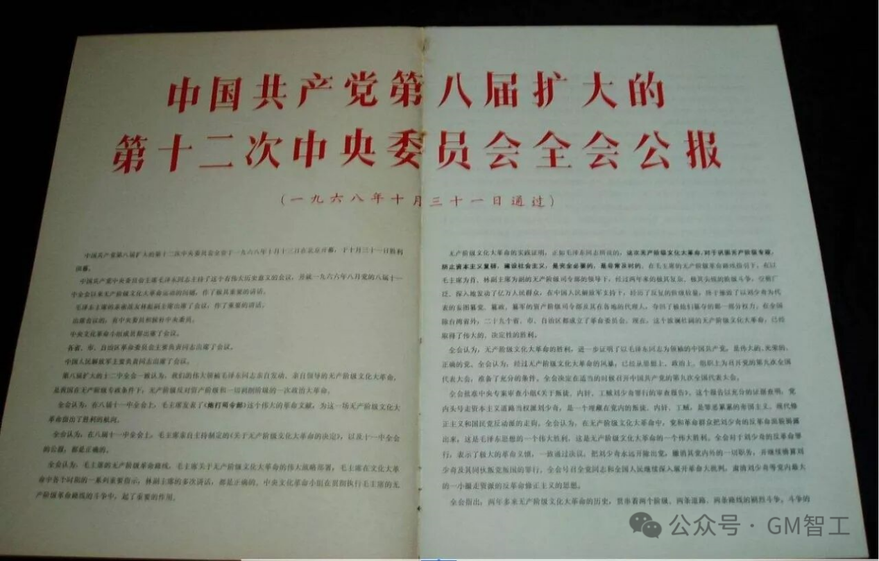 1968年10月13日至31日,为准备召开中共九大,八届扩大的十二中全会在北京举行。这次全会是在极不正常的情况下进行的。八大选出的中央委员总数为97人,除八届十一中全会以来去世10人外,到会者只有40人,不足半数。毛泽东主持全会,并在开幕式上讲话。全会通过《关于第九次代表大会代表产生的决定》和《关于〈中国共产党章程(草案)〉的决定》。全会根据中央专案审查小组《关于叛徒、内奸、工贼刘少奇罪行的审查报告》,给刘少奇强加上“叛徒、内奸、工贼”的罪名,作出了完全错误的政治结论和“永远开除出党,撤销其党内外一切职务”的决议。全会对一大批老一辈无产阶级革命家的攻击、批判,对“文化大革命”的高度赞扬,都是完全错误的。