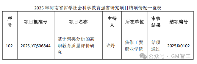 近日,河南省委教育工作委员会与河南省教育厅联合发布《关于公布2025年第三季度河南省哲学社会科学教育强省研究项目结项情况的通知》(豫教工委〔2025〕108号),智能工程学院许丹院长主持的河南省哲学社会科学教育强省研究项目——《基于聚类分析的高职教育质量评价研究》顺利通过评审,正式获批结项。这一成果标志着智能工程学院在教育研究领域取得了新的突破,也为河南省高职教育质量评价研究提供了重要参考。