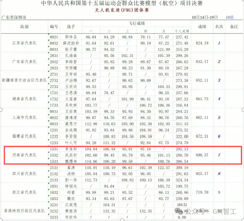 第十五届全国运动会正在深港澳如火如荼地进行,由我校智能工程学院学子李佳轩领衔组成的河南省代表队在群众比赛模型(航空)无人机竞速(F9U)团体赛决赛中,获得第七名的好成绩;