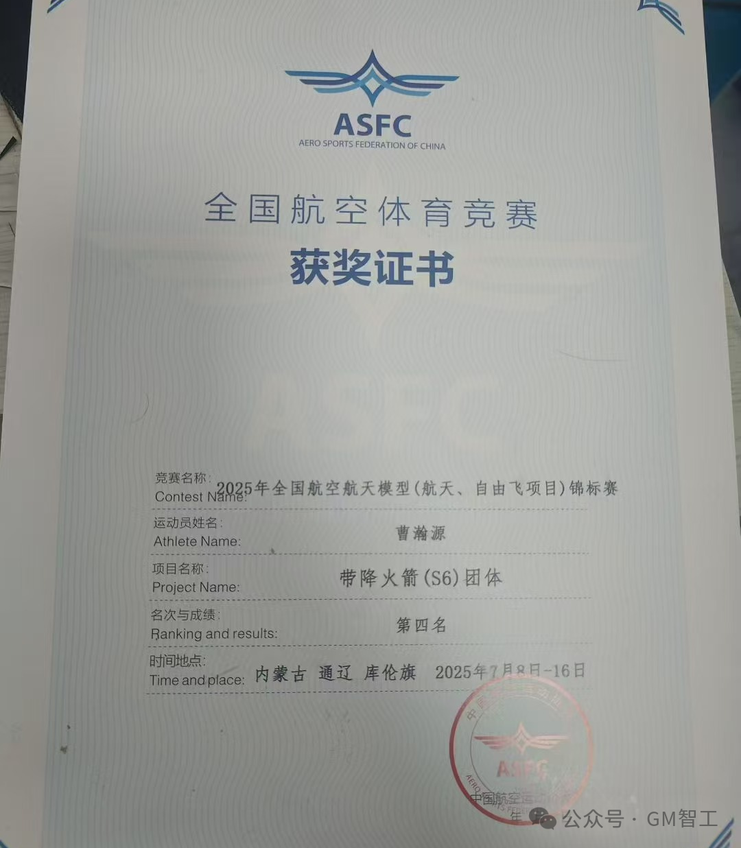 2025年全国航空航天模型(航天,自由飞项目)锦标赛近日传来佳音:我校智能工程学院学子曹瀚源荣获全国第四名的好成绩;