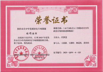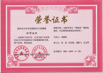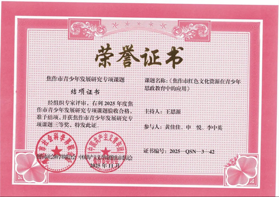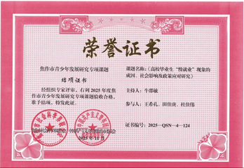 近日,焦作市青少年发展研究专项课题结项名单正式公布,结项证书随之发放。我院王思源、牛邵敏、任梦慧、刘淑婷、申悦等多位教师主持的课题成功结项,其中王思源老师的课题荣获三等奖。充分展现了我院在青少年发展领域的研究实力与育人思考。