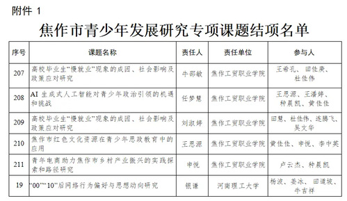 本次结项课题聚焦青年就业、AI技术与青少年思政教育、红色文化育人、青年助力乡村振兴等青少年发展关键领域,立足焦作本土实际与青年群体需求,从理论研究到实践路径展开深入探索,相关成果为青少年成长引导、地方青年工作推进提供了有力的智力支撑。