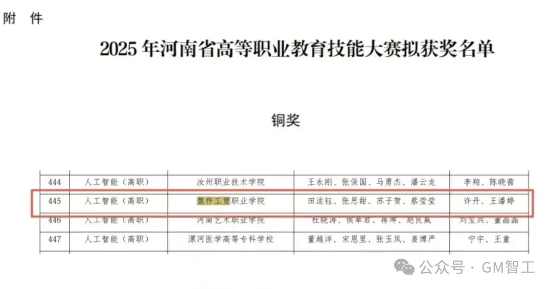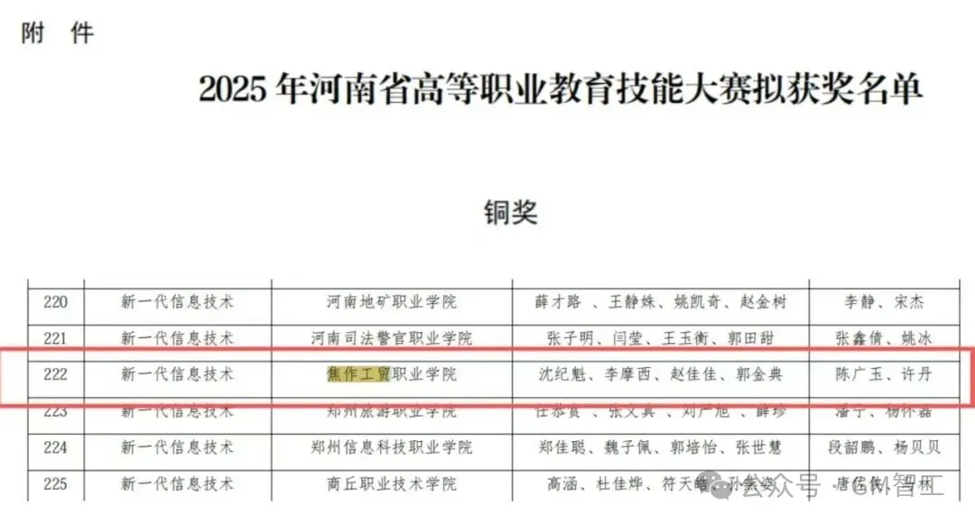 近日,2025年河南省高等职业教育技能大赛成绩公布。焦作工贸职业学院智能工程学院学子凭借扎实的专业功底、默契的团队协作和出色的临场发挥,在激烈角逐中脱颖而出,斩获新一代信息技术赛道与人工智能(高职)赛道两项铜奖,彰显了学院过硬的人才培养质量,让我们一同走进这场赛事,探寻学院学子们的精彩表现。