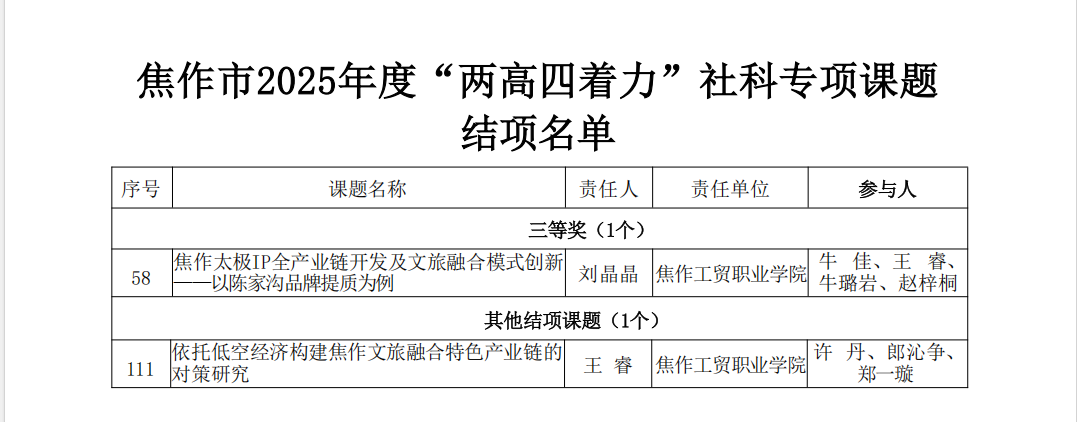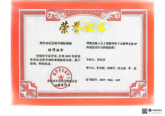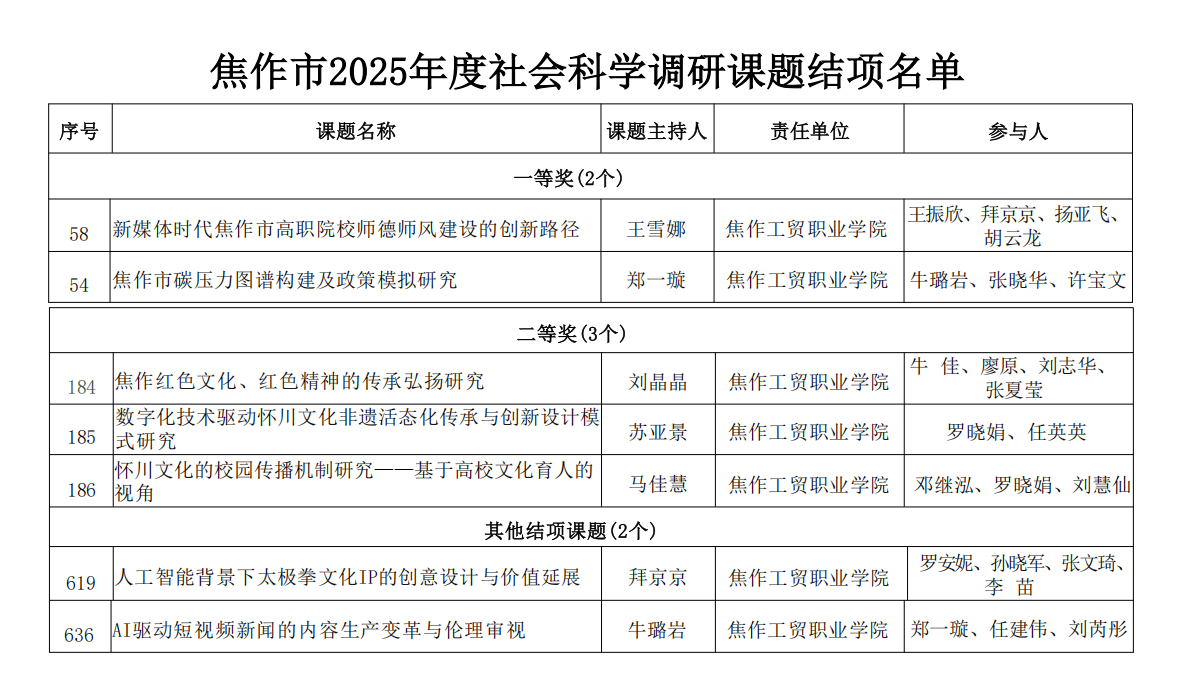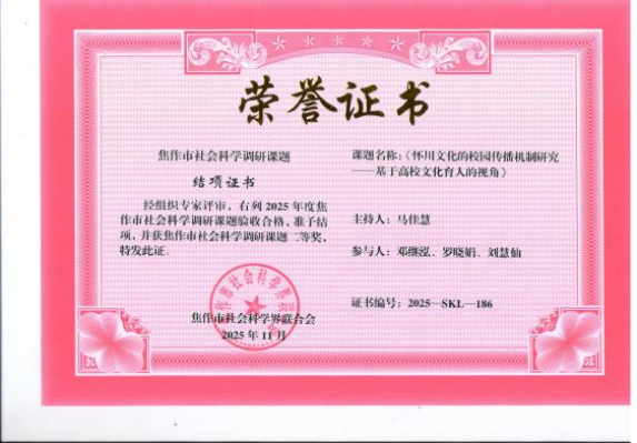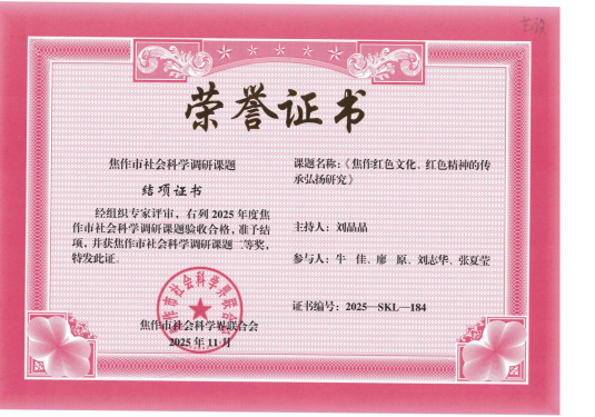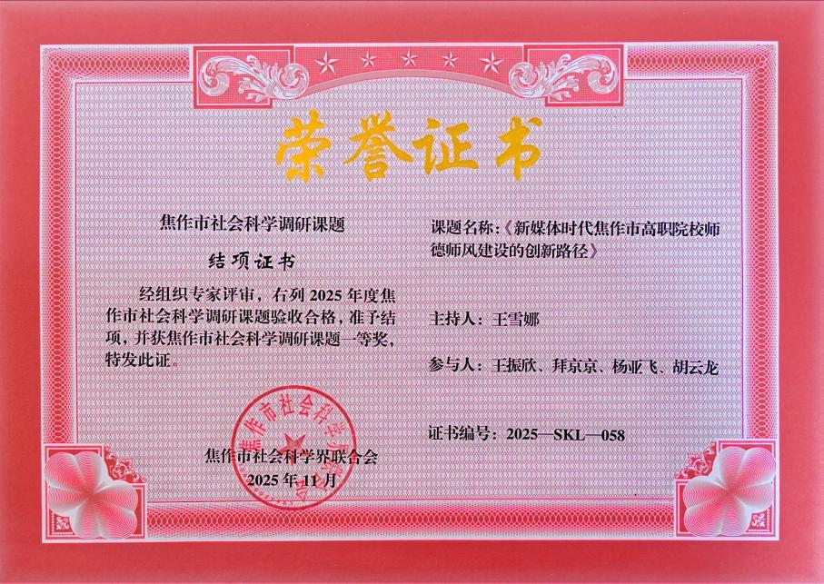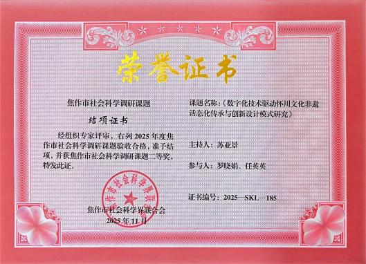 近期,焦作市社会科学界联合会公布了年度社会科学调研课题和“两高四着力”专项课题结项评审结果。艺术设计学院在此次评选中表现突出,成果丰硕,共荣获一等奖两项、二等奖三项、三等奖一项,另有三项课题顺利通过结项。这一佳绩充分展现了学院在社会科学研究领域,特别是服务地方文化发展与应用实践方面的强劲实力与深厚积淀。